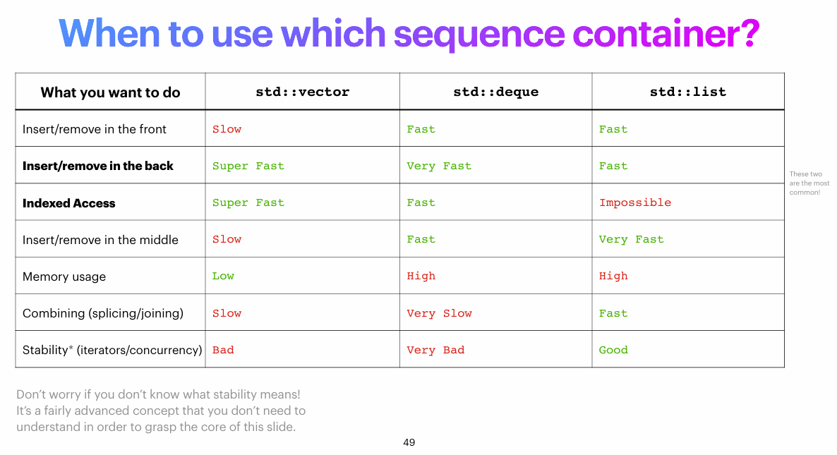 std::vector: use for almost everythingstd::deque: use if you are frequently inserting/removing at frontstd::list: use very rarely, and only if you need to split/join multiple lists