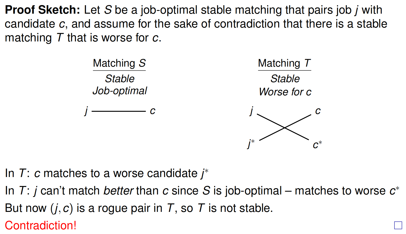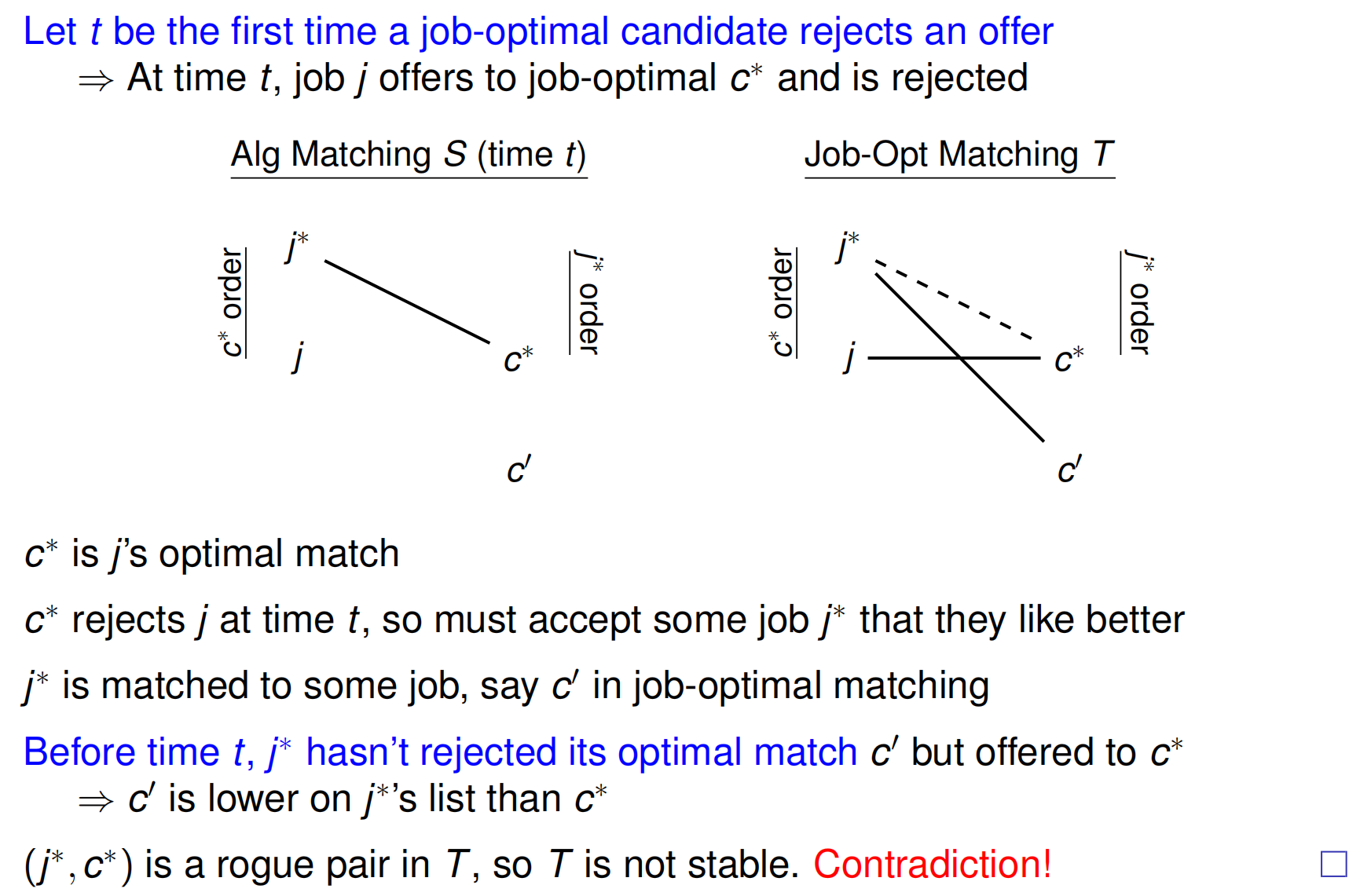 我们假设存在一次情况出现了\((c,j)(c',j')\),其中对\(j\)而言\(c'>c\),那么实际上\(j\)应该先于\(j'\)被分配给\(c'\),并且由Improvement Lemma,不会有\(c'-j'\)且\(j\)出局的状态,矛盾,所以stable.