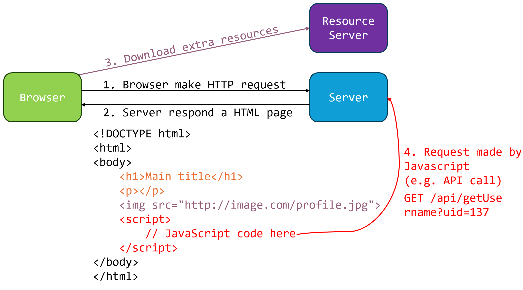 /api/getUsername?uid=137,这是一个典型的AJAX调用,用于动态获取用户数据; - 如果成功,对DOM (Document Object Model,web 上构成文档结构和内容的对象的数据表示) 进行修改\(\textcolor{red}{(红色)}\),