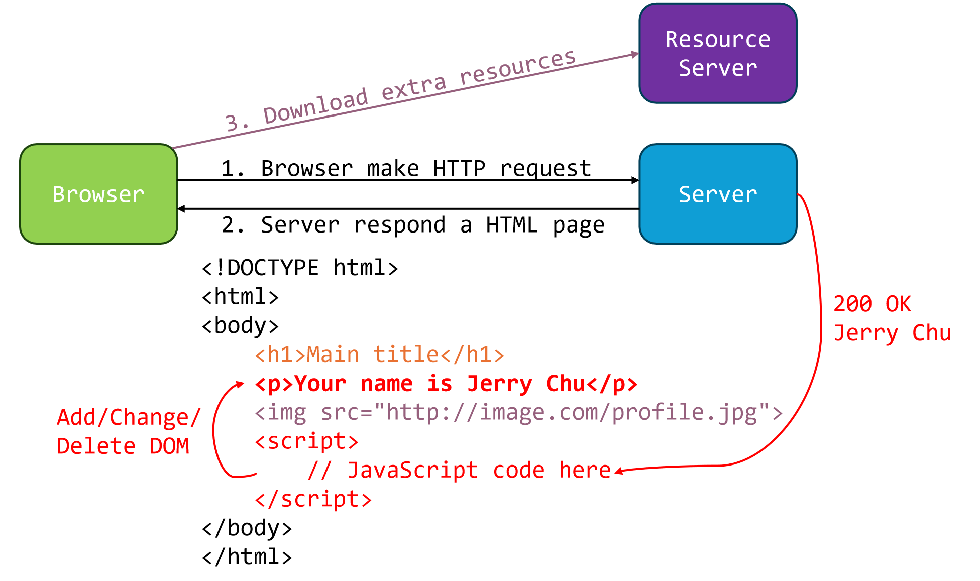 - 向Server发送请求,Server回复一个HTML \(\textcolor{orange}{(橙色)}\),调取外部资源\(\textcolor{purple}{(紫色)}\);