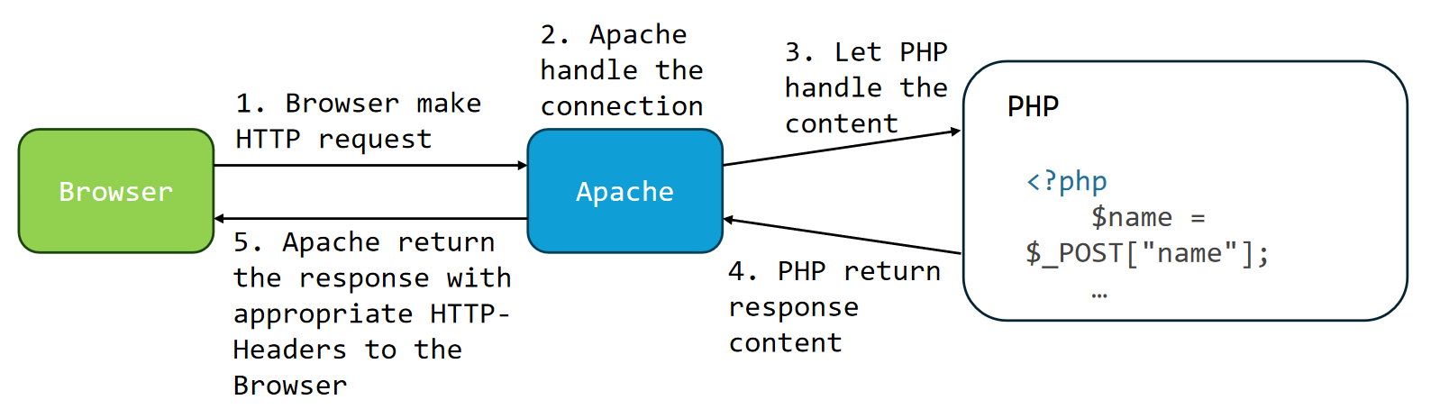 当浏览器传输http请求时,先发给Apache服务器,然后让php处理这个请求,并且返回给Apache.