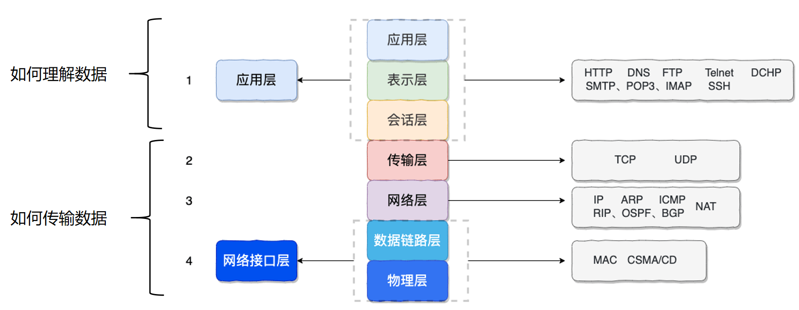 - 功能上来说,主要分为两大部分,首先是理解数据(应用层),其次是传输数据(网络接口层)