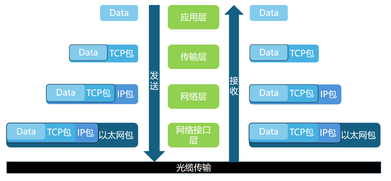 传输单位:数据包,传输过程:层级传递