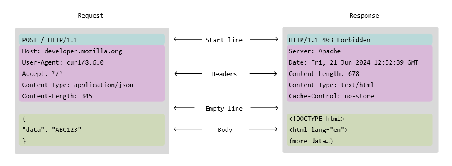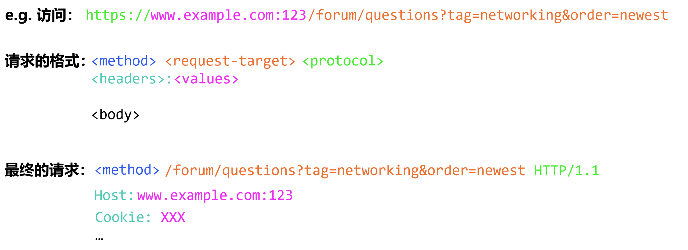 <method<request-target<protocol> <headers>:<values> <body>可以对照色块观察:其中\(\textcolor{blue}{\text{< method >}}\)是POST/GET,高中技术已讲过.