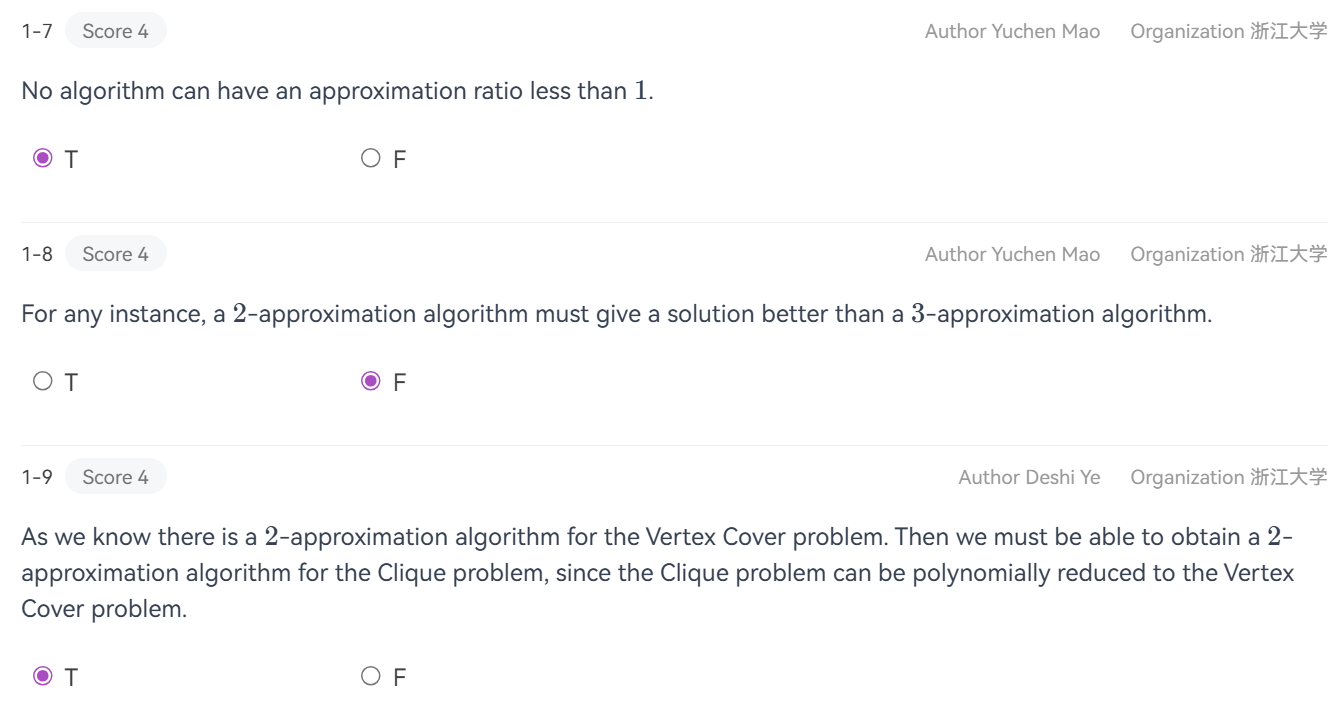 FPTAS(Fully-polynomial-time approximation scheme, 完全多项式时间近似方案): ,定义更为严苛:在上面的基础上,要求运行时间关于\(n\)和\(\dfrac1\epsilon\)都是多项式.