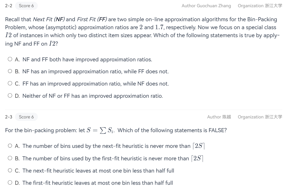 - BestFit (放进去以后剩余空间最少的bin): \(\text{worst} = 1.7M-1.7\)