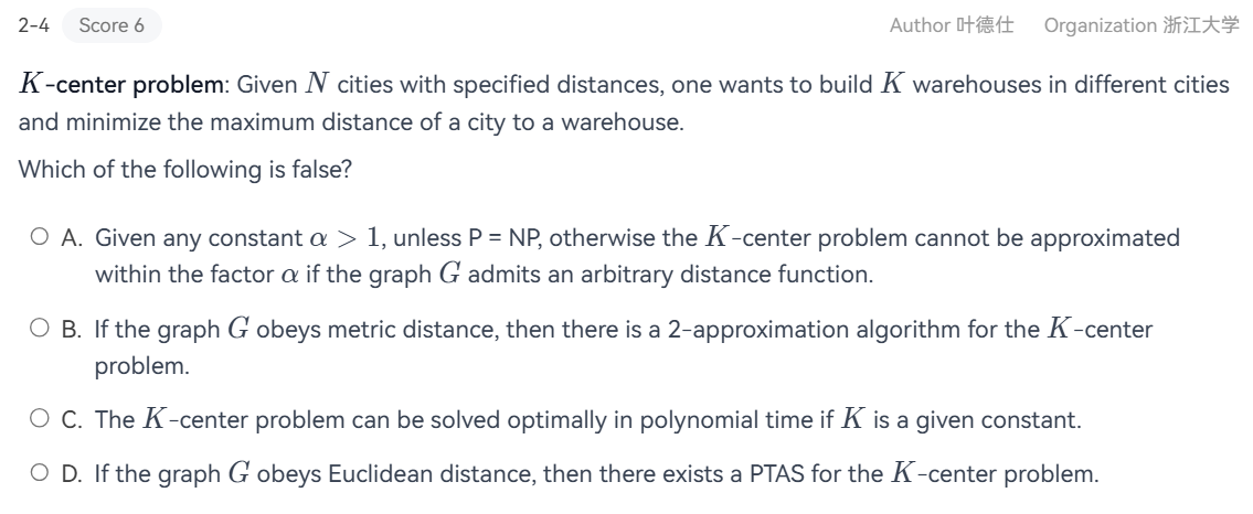 分析:一个圆可以由 2 个点(直径)或者 3 个点(三角形)确定,不妨认为是 3. 那么,我们总共可以找到 \(C_n^3 \simeq n^3\) 种 3 个点的组合方式,计算其构成的圆的半径. 最优解即为在上述组合方式中每次选出 \(K\) 个,判定是否覆盖所有点,记录满足条件的最小结果(半径),因此组合方式是 \(C_{C_n^3}^{K} \simeq C_{n^3}^{K} \simeq n^{3K}\) 个. 如果认为 \(K\) 是常数,则这是一个多项式级别的算法. 但是 \(K\) 最多可达 \(n\) 的大小,因此在最大情况下为 \(n^{3n}\),这不是多项式级别的.