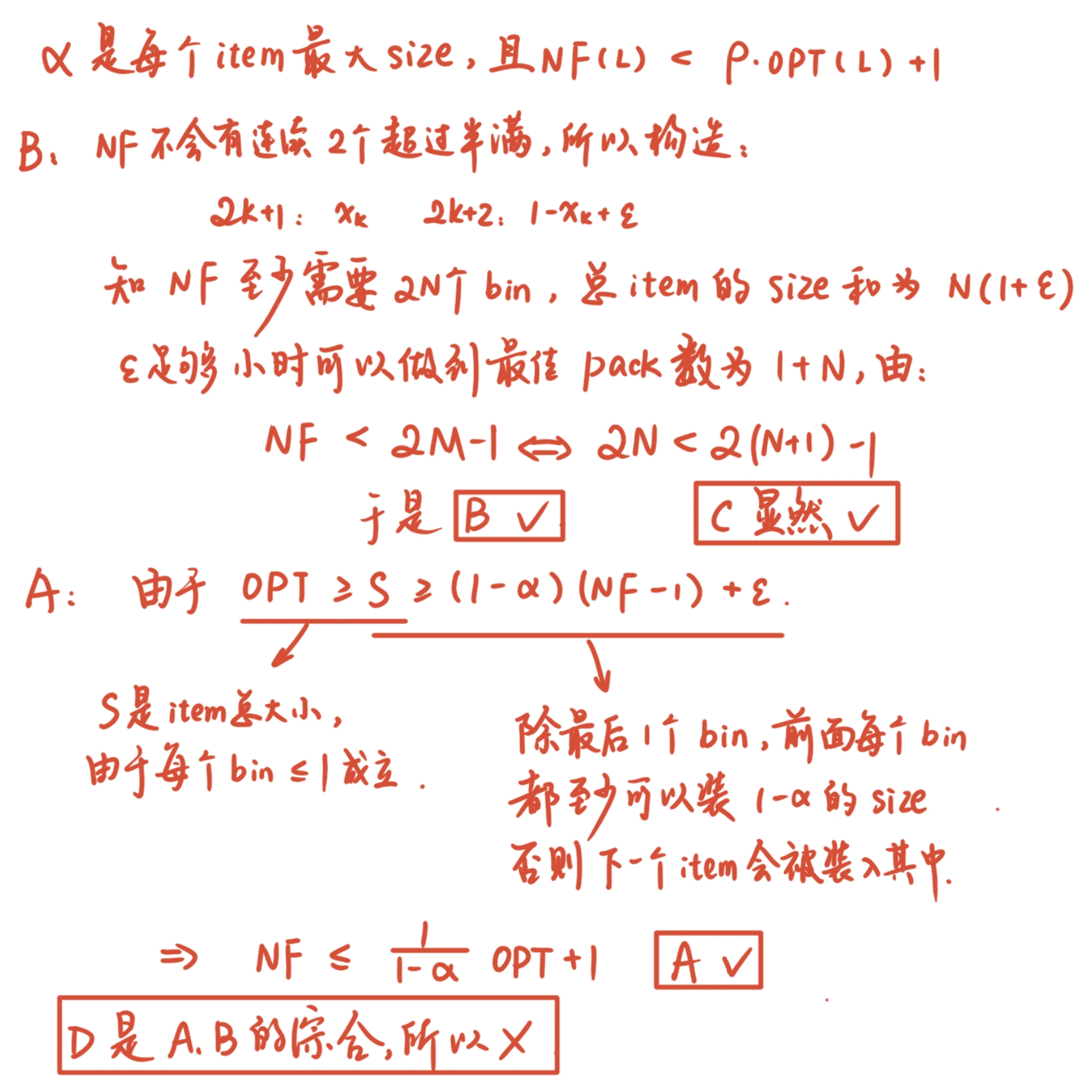 - NextFit (如果前一个bin能放下就放,放不下新开一个): \(\text{worst} = 2M-1\)