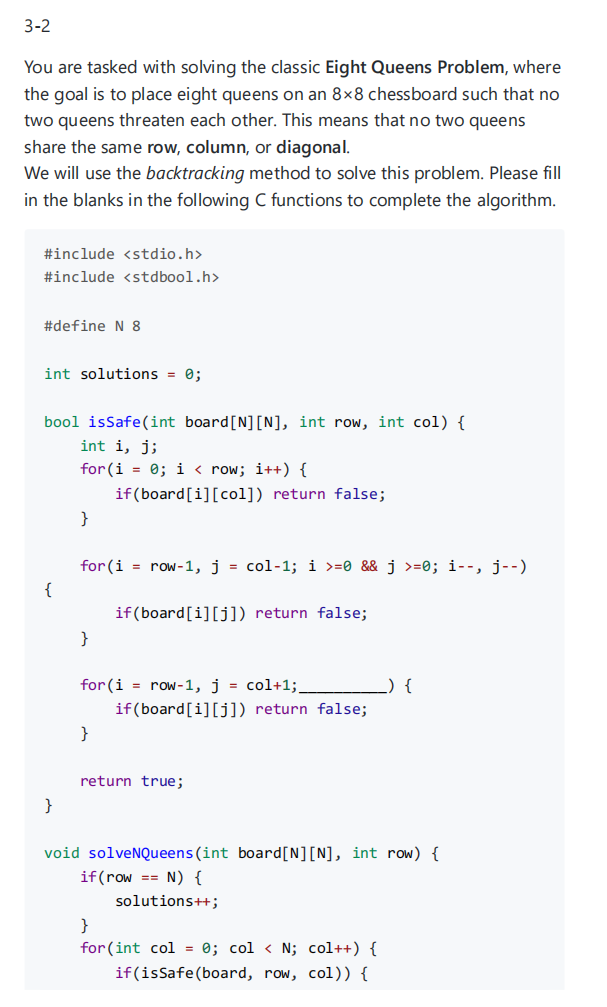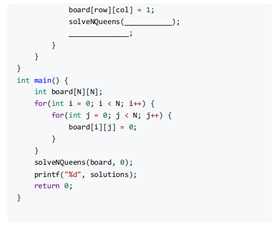 答案:i >= 0 && j <= N-1 ; i--, j++, board;row+1, board[row][col] = 0.