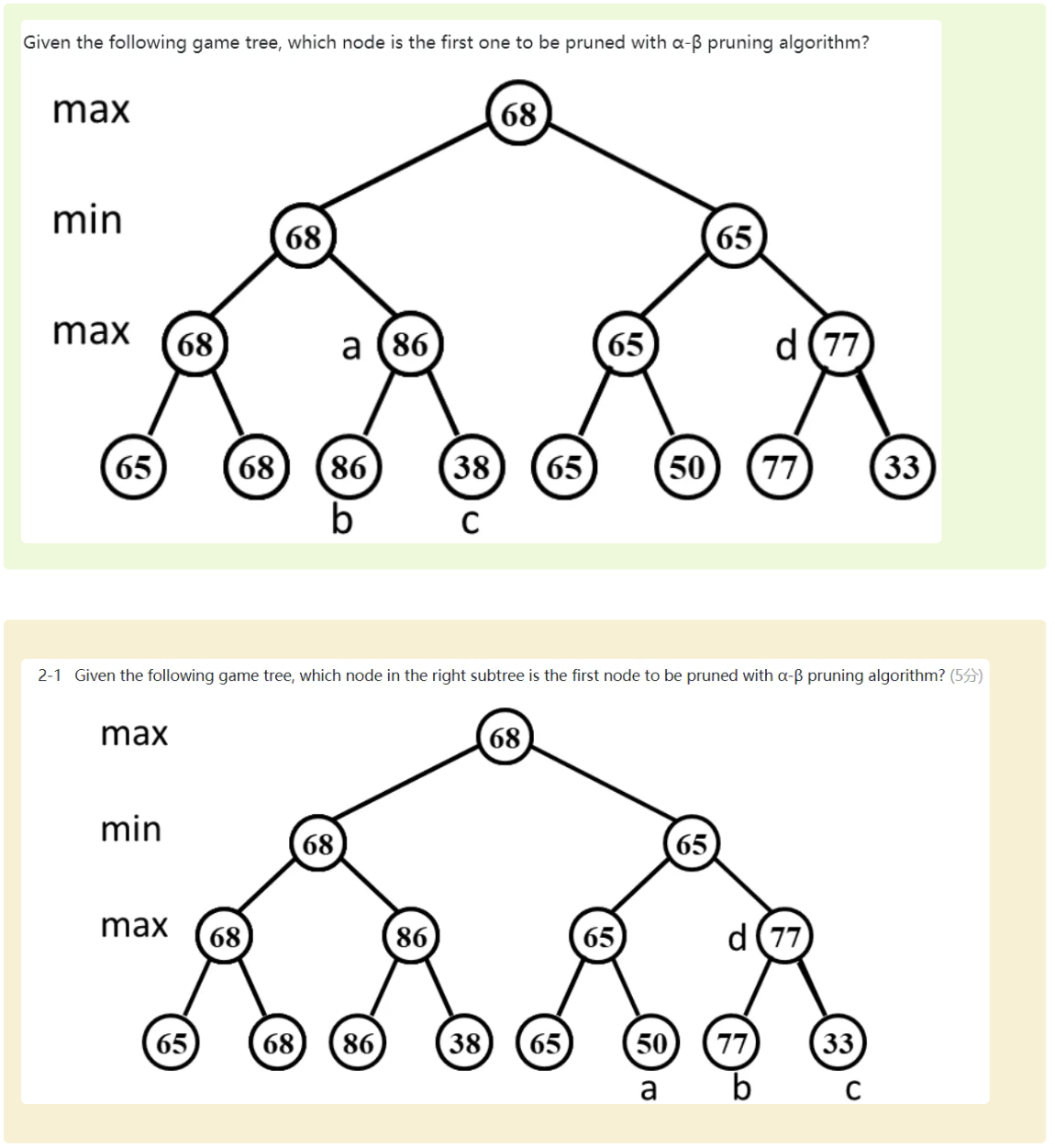 \(\beta\)-pruning: 修剪掉min一层的节点.