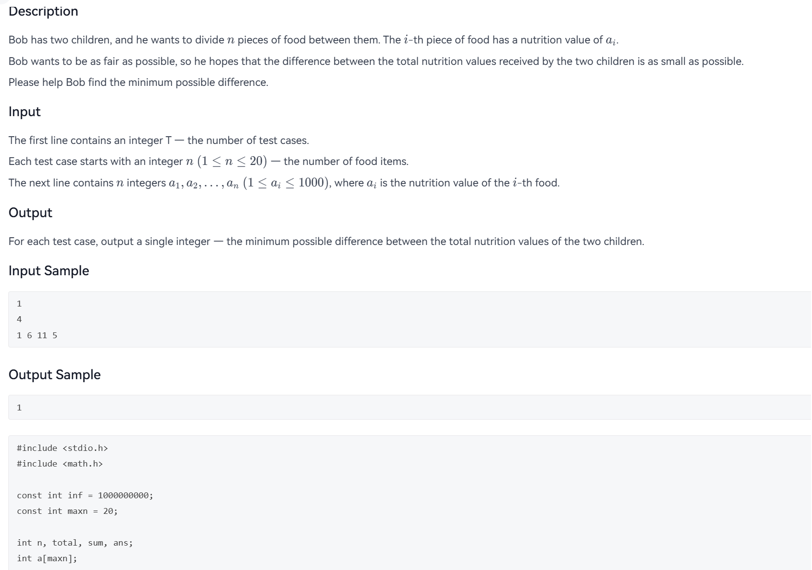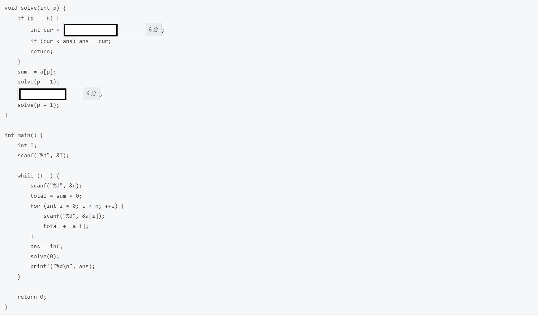 答案是fabs(2 * sum - total)和sum -= a[p]