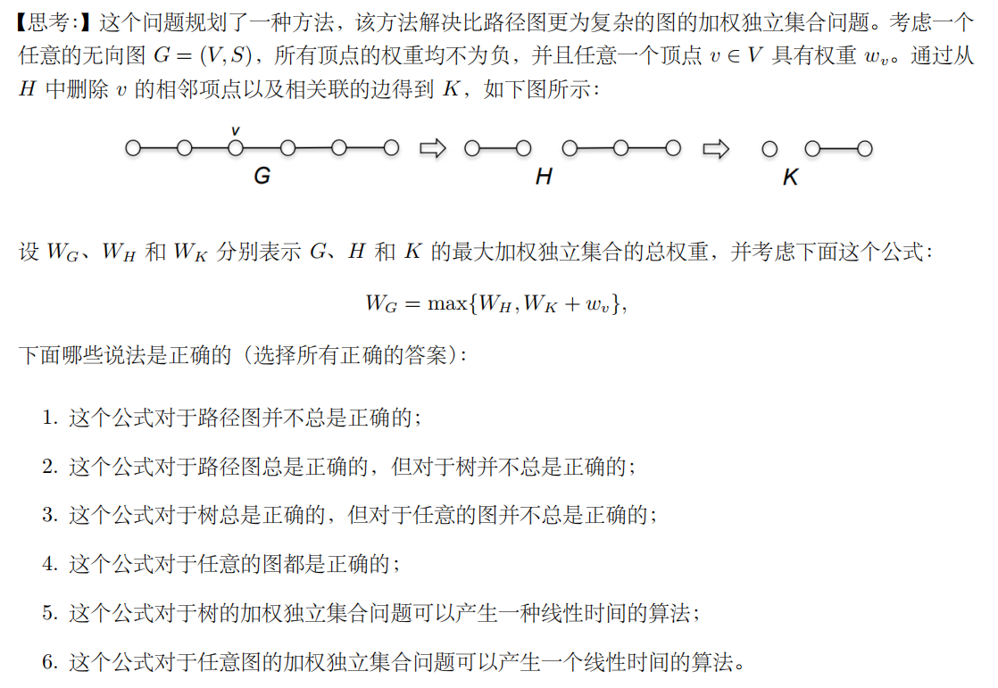 考虑一个无向图\(G\),其上所有点都在同一条线上,每个点都有一个非负权重. 称\(G\)的独立集合是顶点互不相邻的子集. 我们需要找到具有最大顶点权重和的独立集合.