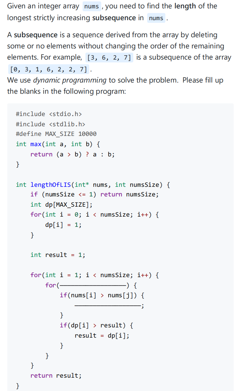 答案:int j = 0; j < i; j++, dp[i] = max(dp[i], dp[j]+1)