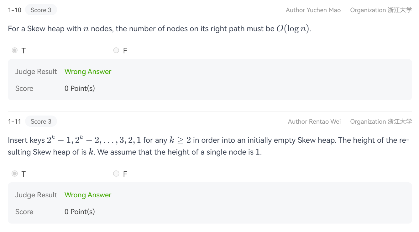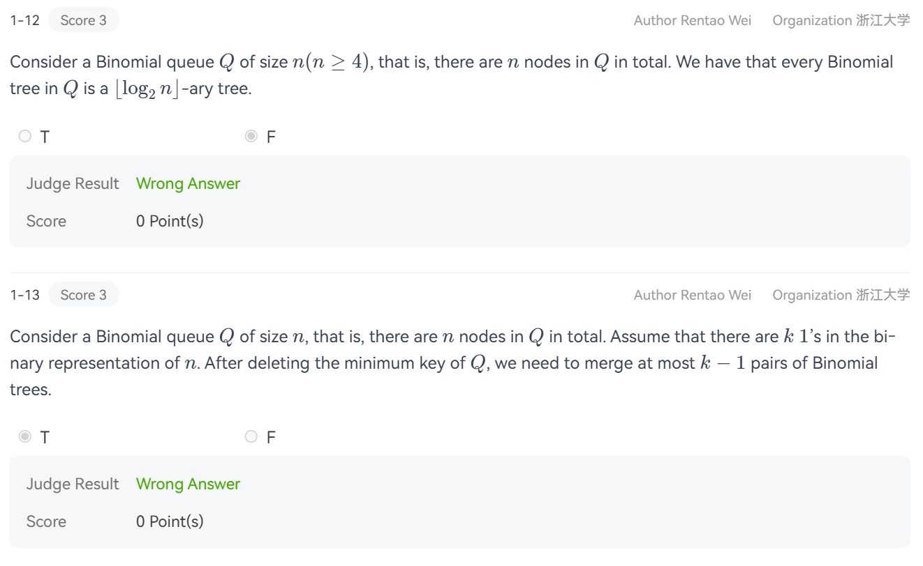 第1题的情况是,会误以为 \(k\)-ary tree 要求度必须“恰好”等于 \(k\),但实际上只要“不超过” \(k\) 即可。因此该命题为 True.