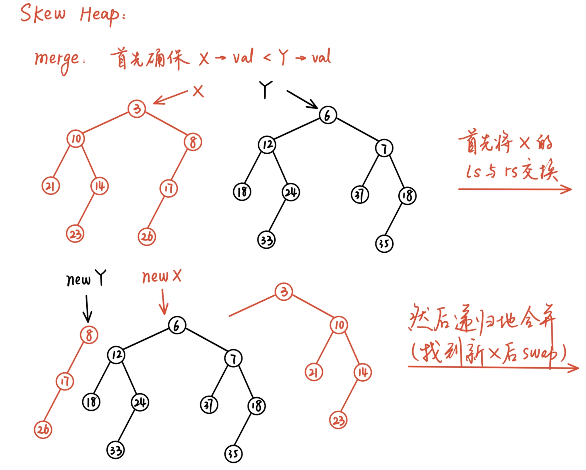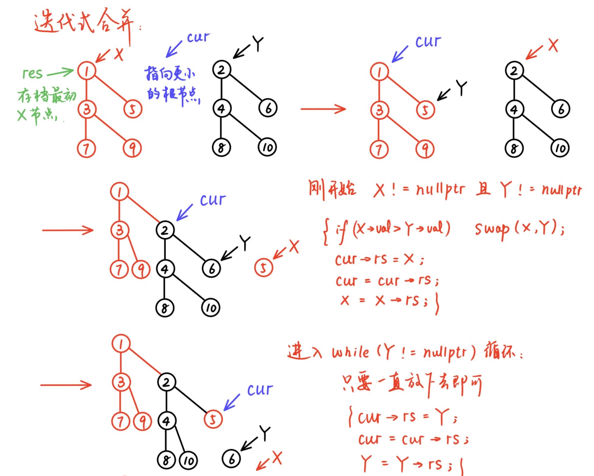 递归式的思路是:首先确保\(X,Y\)合并时,\(X\)的值比\(Y\)小(不满足则交换\(X,Y\));其次将\(Y\)放到\(X\)的右子树上去比较,相当于递归地与右子节点合并;当某一个值为NULL时递归结束.