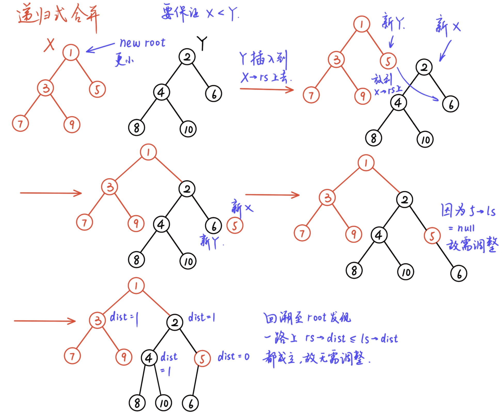 这个过程中,为了确保左式堆的性质,我们需要对合并的树进行一些调整:如果合并之后左右子树dist数量关系错误,则交换\(X\rightarrow ls,X\rightarrow rs\);接着对\(X\)的\(\text{dist}\)重新计算,确保递归过程中每一层\(X\)的值能倒着更新回去.