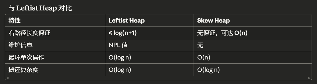 | DeleteMin | 摊还 \(O(\log N)\)(基于合并操作实现) | 摊还 \(O(\log N)\)(基于合并操作实现) | \(O(\log N)\) |