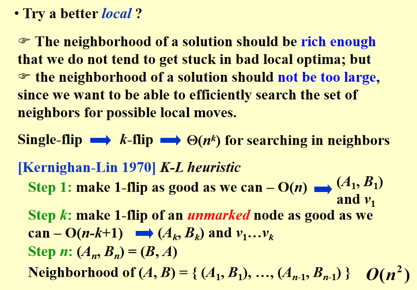 这样我们的搜索策略就是,从一个可行的solution开始,在neighborhood之内寻找一个更好的solution. 如果不存在更好的改进,则这个solution就是local optimum.