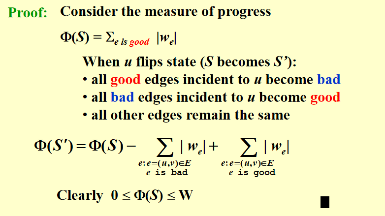 该算法在最多\(\sum|w_e|\)次迭代后终止,因为每次翻转都会增加好边权重之和,且该和有上界\(\sum|w_e|\).
