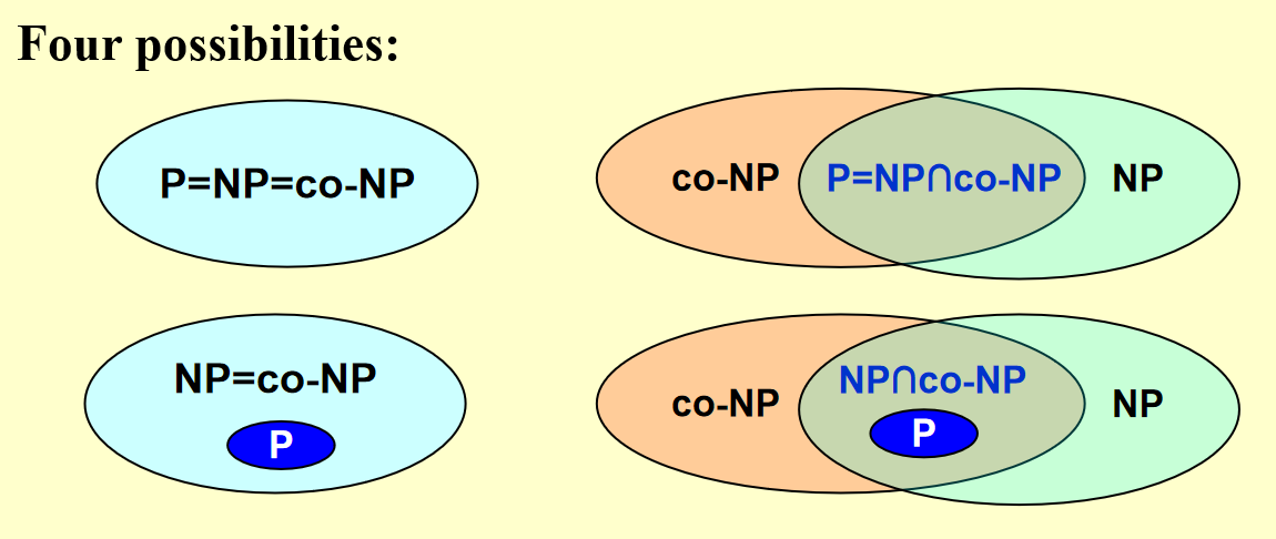 - 如果\(\textbf{co-NP} \neq \textbf{NP}\): 可能是\(\textbf{P} = \textbf{NP} \cap \textbf{co-NP}\),或者\(\textbf{P} \subset \textbf{NP} \cap \textbf{co-NP}\);