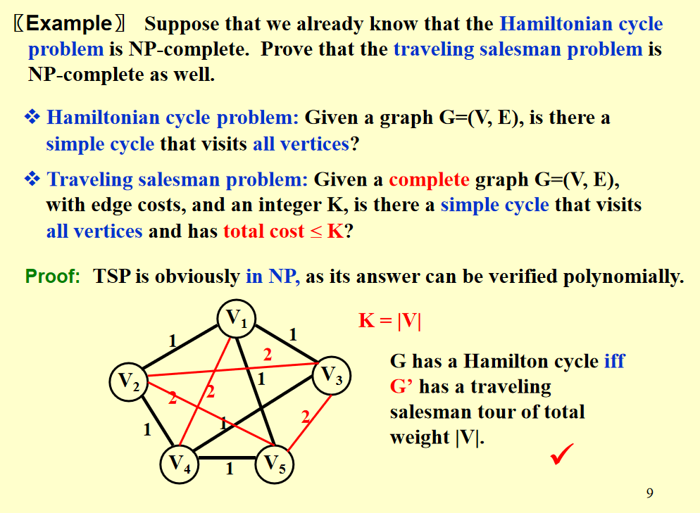 由于完全图的边数为\(\dfrac{n^2+n}{2}\),因此这个转换过程是多项式时间复杂度的. 综上,我们从Hamiltonian cycle是\(\textbf{NPC}\)问题推出了TSP是\(\textbf{NPC}\)问题.