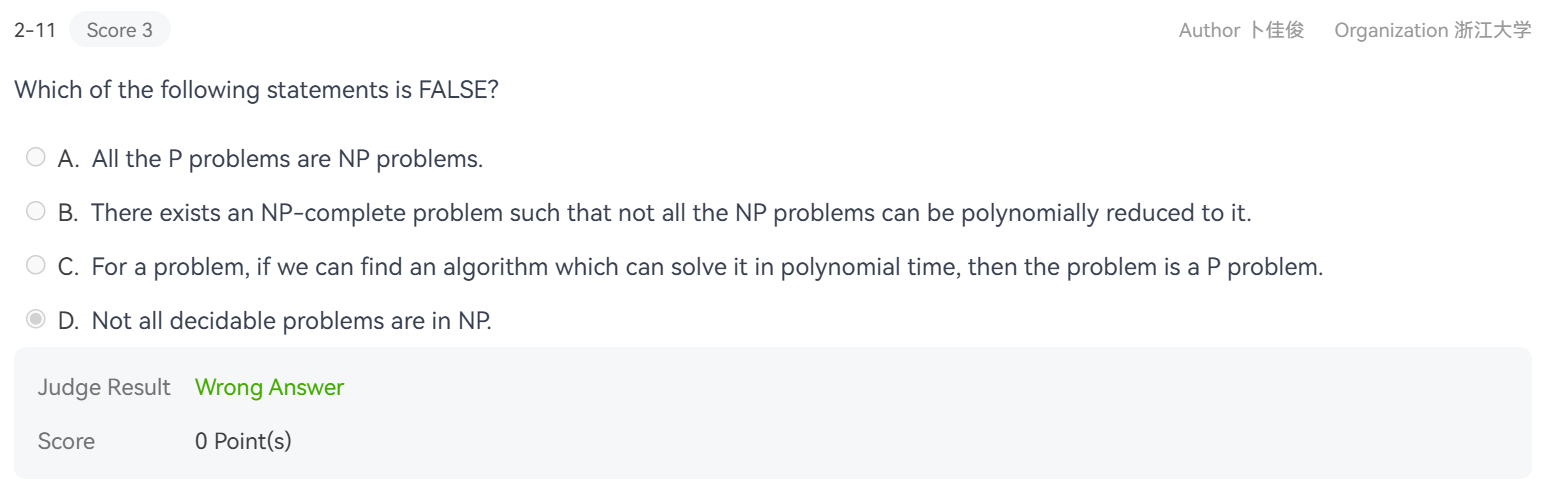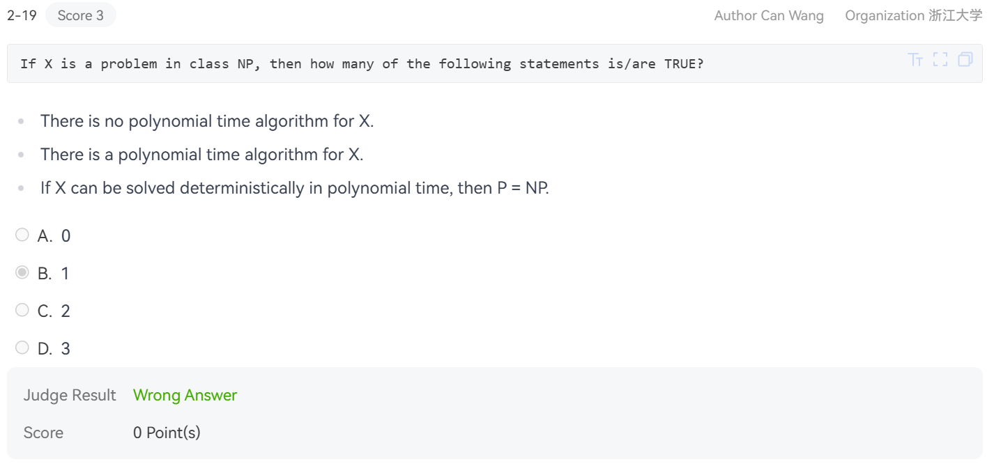3个表述全错,因为\(X\)并不一定是\(\textbf{NP-complete}\)问题,如果是,则由属于\(\textbf{P}\)可以推知\(\textbf{P} = \textbf{NP}\),但\(X\)也可以是属于\(\textbf{NP}\)与\(\textbf{P}\)的交集中,从而不能推出这个结论.
