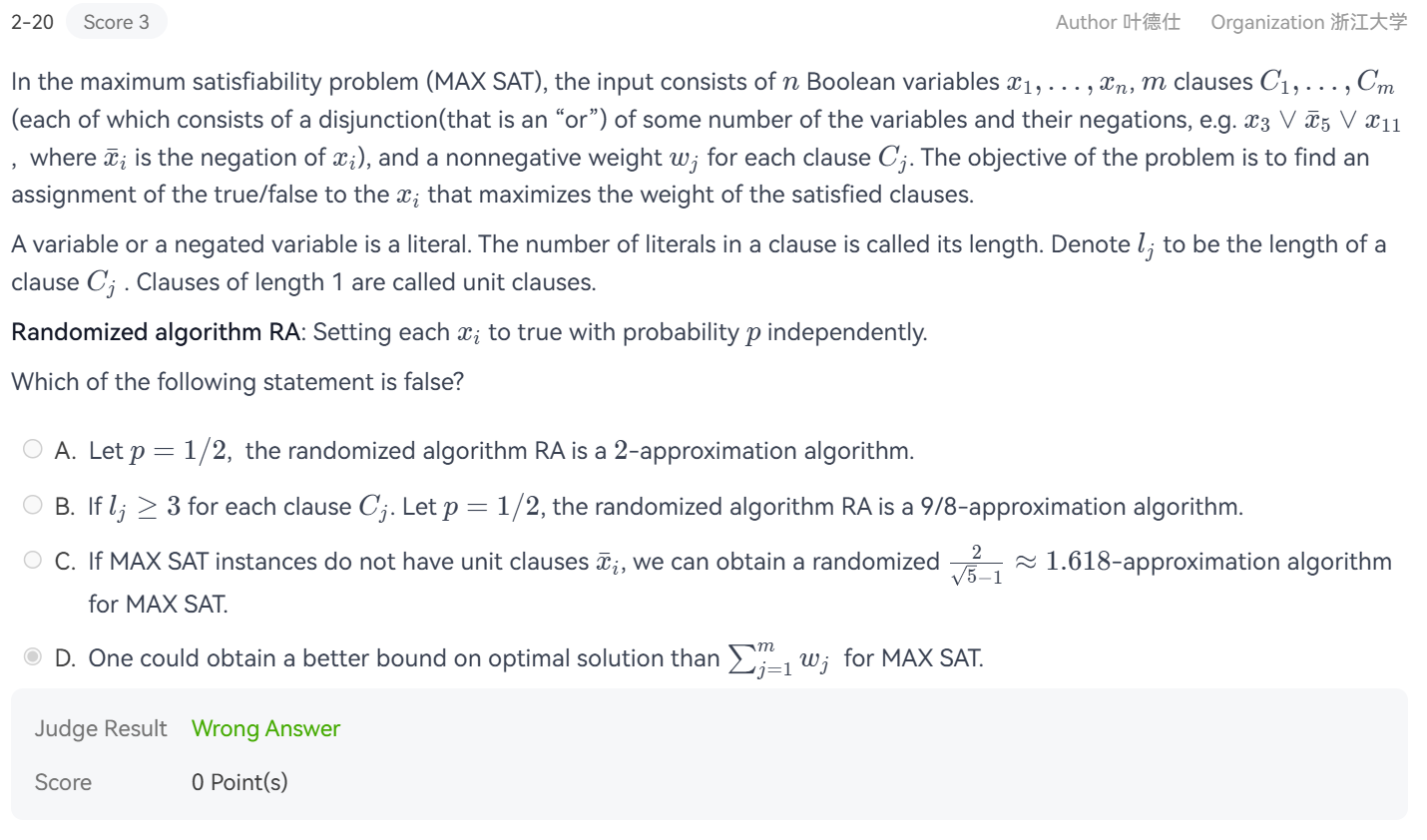 A、B 选项:对于长度为 \(l\) 的子句,该子句不被满足的概率为 \(p^{l}\),故被满足的概率为 \(1 - p^{l}\),对 应的总近似比就是 \(\frac{1}{1 - p^{l}}\);