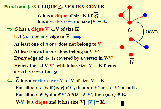 充分性 :若 \(G'\) 有大小为 \(K'\) 的 Vertex Cover \(V'\),则 \(V \setminus V'\) 是 \(G\) 的 Clique.