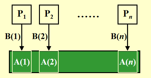 - 结构: 拥有 \(n\) 个处理器 (\(P_1 \sim P_n\)) 和一个巨大的共享内存 (Shared Memory).