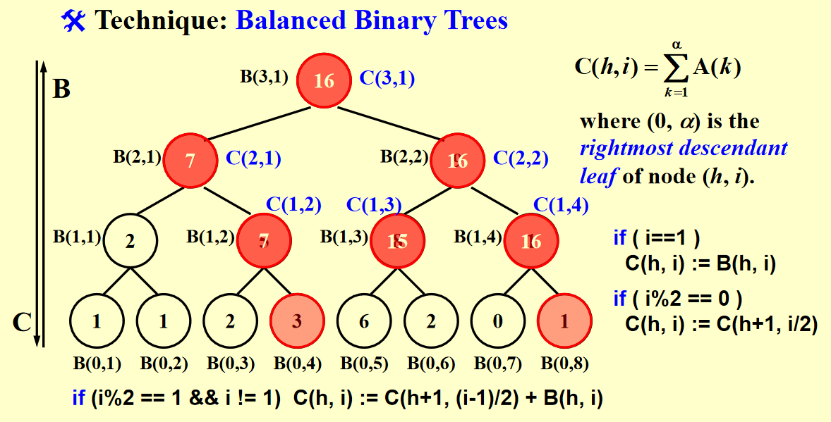 规定前缀和\(C(h,i) = \sum\limits_{k=1}^{\alpha} A[k]\),其中\((0,\alpha)\)是二叉树的节点\((h,i)\)最右侧路径的叶子节点的位置(容易发现\(\alpha = 2^{h-1}+i\)).
