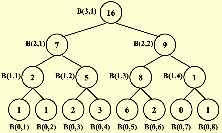 B(h,i) = B(h-1, 2i-1) + B(h-1, 2i)