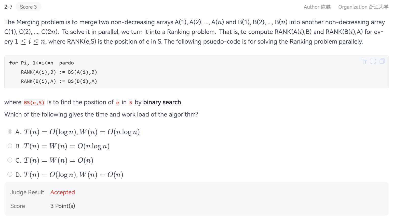 据上面的分析,有\(n\)组并行任务,每个并行任务的复杂度(即单个处理器所需的时间\(D\))是二分的复杂度\(O(\log n)\),所以\(W(n) = O(\log n) \times n = O(n\log n), D(n) = \log n\).