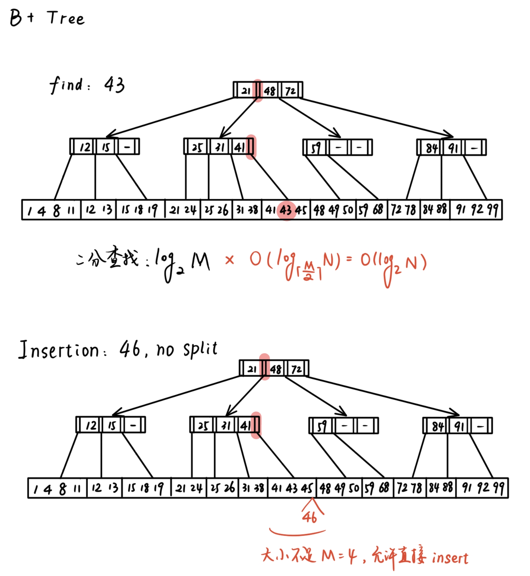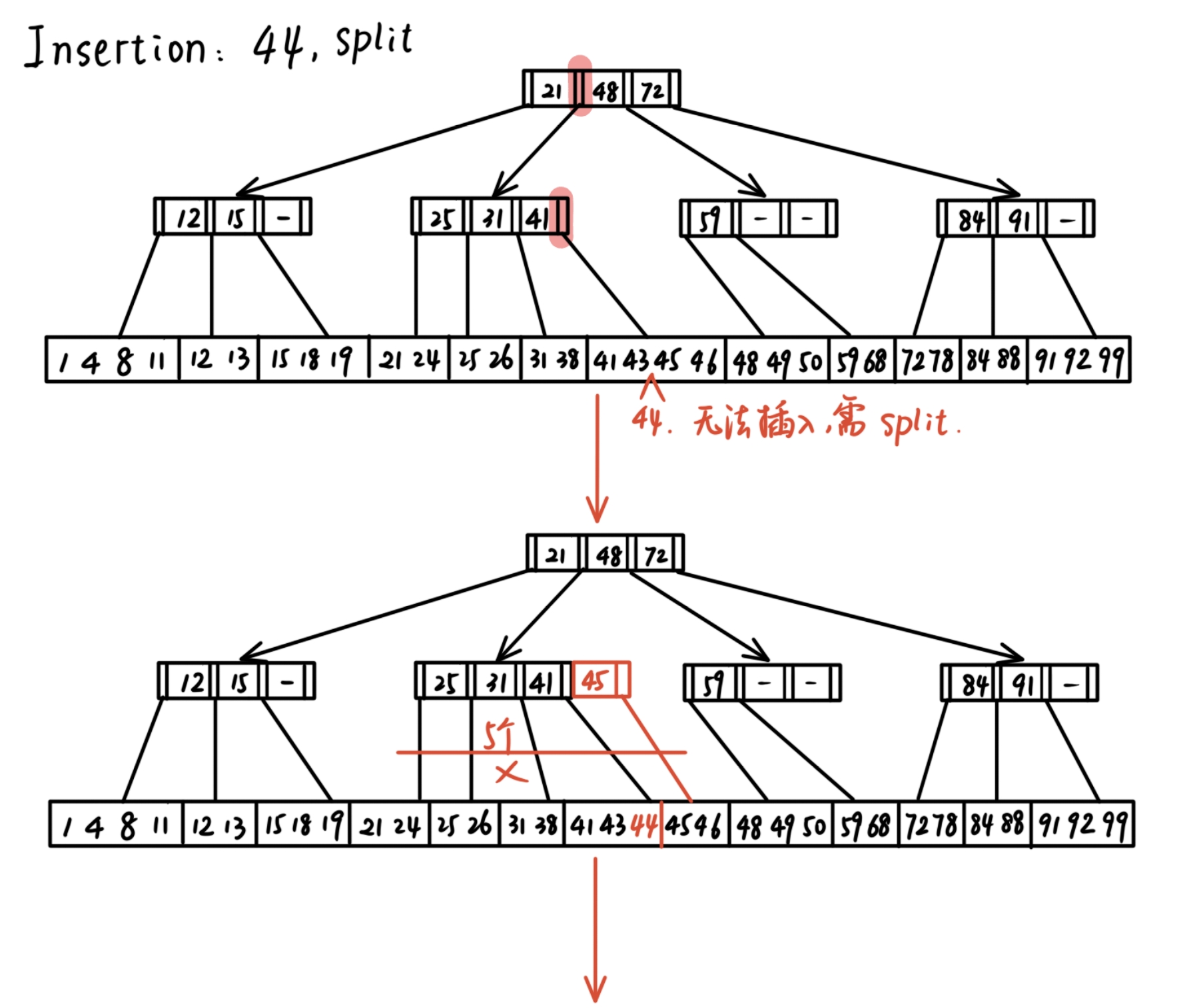 插入操作的探讨要分成2部分,第一是插入之后的叶子节点内数量没有超过order,因而不需要split,此时已经结束;第二是需要split的情形,此时需要递归向上进行分裂.