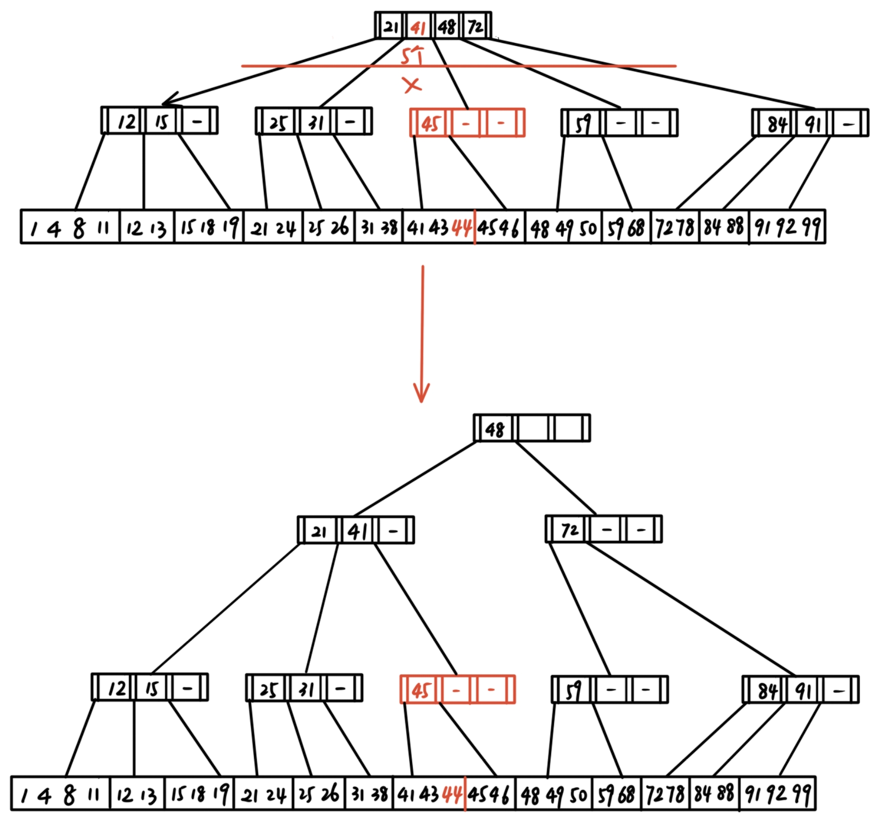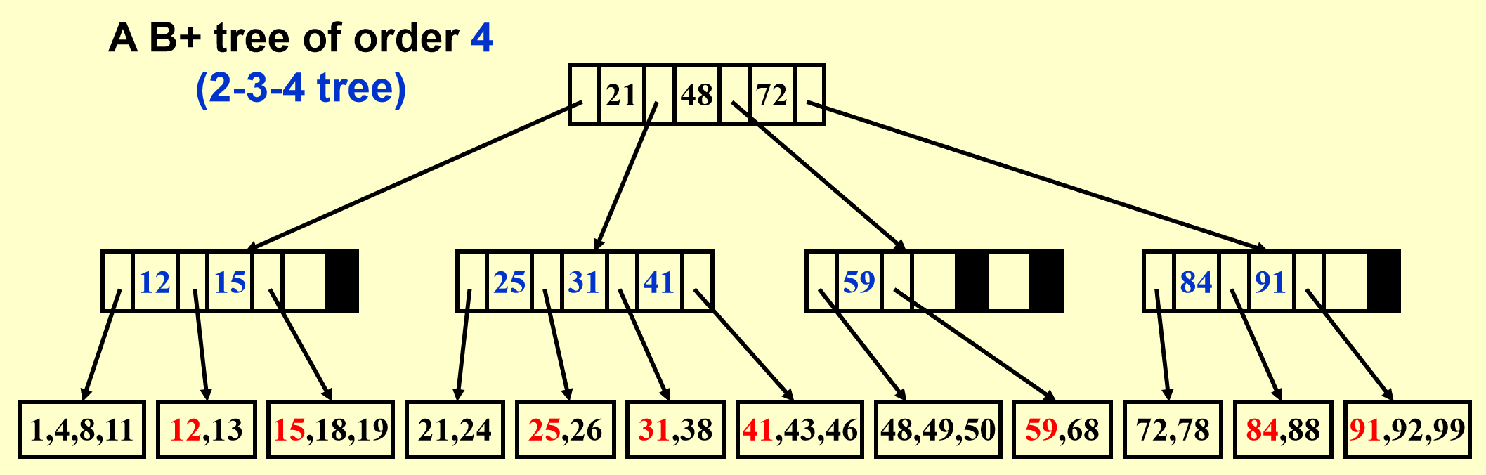 一颗\(\text{order} = 4\)的B+树也称为\(2-3-4\)树,其中internal node键值最多3个,指针最多4,与order相等.(这部分跟wiki的定义是不一样的)
