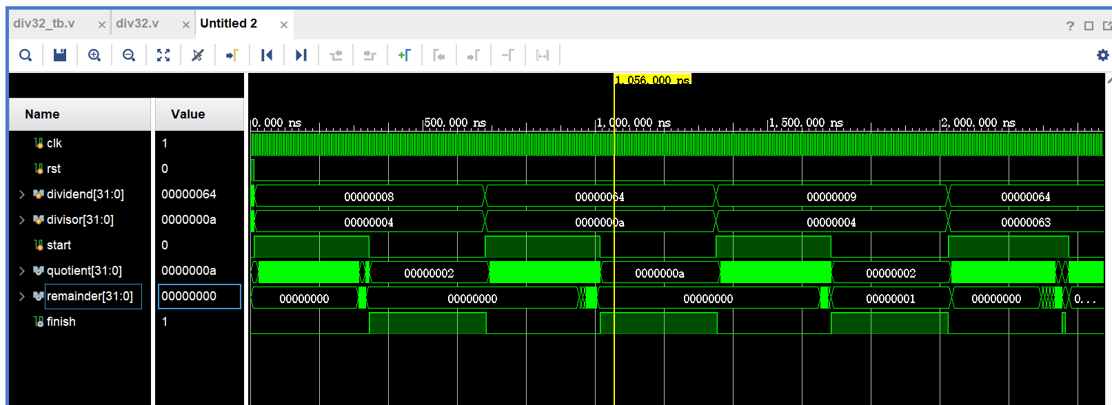 .\OExp03\OExp03-div32\div32.srcs\sim_1\imports\new\div32_tb.v测试tb文件中给的输入样例,实现PPT P35所示效果,在计算开始后quotient和remainder的输出也需要体现移位过程