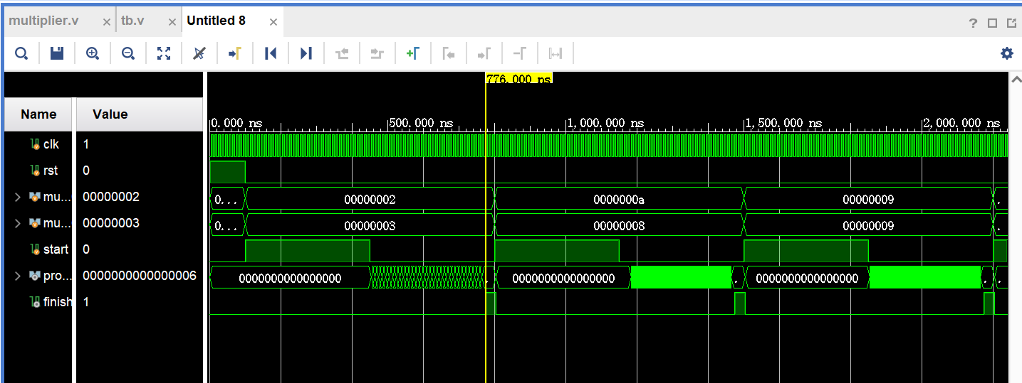 .\OExp03\OExp03-mul32\mul32.srcs\sim_1\new\tb.v测试tb文件中给的输入样例,实现PPT P20所示效果,在计算开始后必须体现移位过程,即需要体现这段波形: