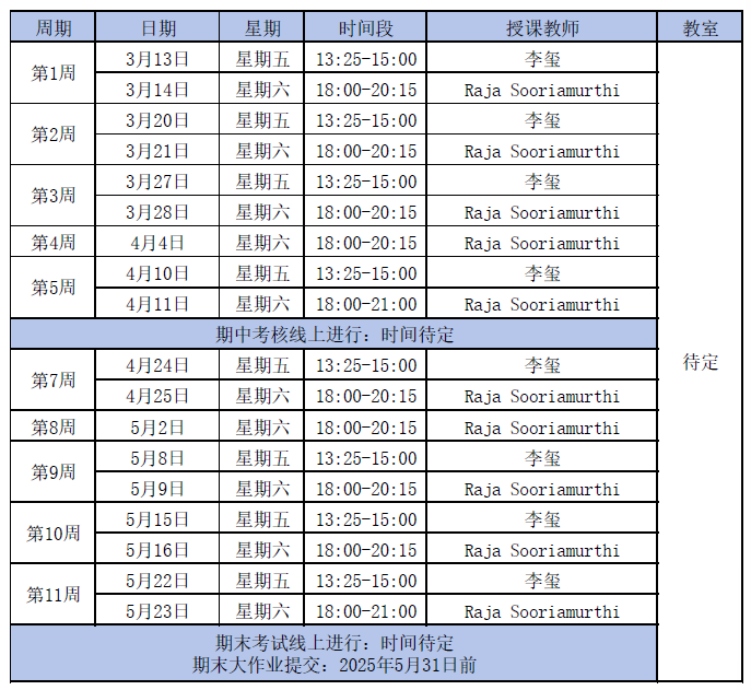 概述 国际化课程:机器学习在数据分析上的实际运用. 课程信息 中方教师:李玺,外方教师:Raja Sooriamurthi(CMU) 分数构成: 出勤+平时作业 20%。 两次测试(40%):A.期中线上测验(20%),B.期末结课报告(20%)。 项目大作业:40% 课程表: