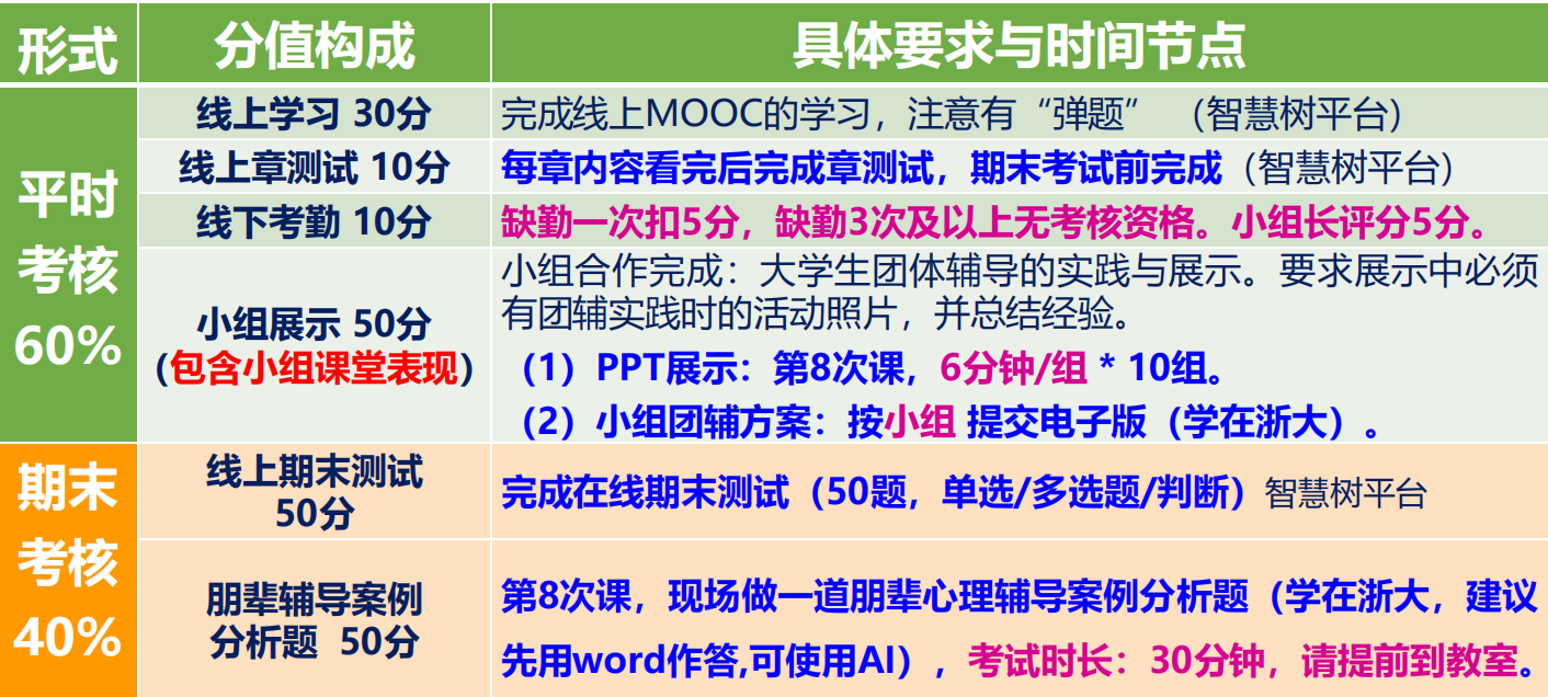 上课是两个时间段,但是有一个是不用上的,自己抽空挂一下课时就好,主要任务是完成一次团辅活动,需要拉人和策划,并且占用课外时间,但是喜欢这种活动的同学可能是会比较享受的。最后有一个简短的开卷考试(可AI),要求word提交,因此方便的话还是带个电脑比较好。